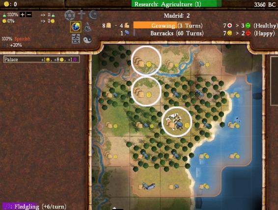 Notice that I'm only getting 1 shield/turn here. That's ok! I'm not actually trying to build the barracks, I'm trying to grow Madrid up to size 3 so I can swap to a worker. Notice also the culture in the bottom left corner of the screen. Since Madrid is the Hindu holy city, I'm getting 1 culture from the palace, 1 culture from having Hinduism (my state religion) in the city, and 4 culture from Madrid being the Hindu holy city. This is a big deal in the early game, and another reason why early religions can really help you out. After finishing Polytheism, you can see my religion now went into Agriculture. I need my workers to be able to build farms to use those floodplains properly, so I slipped Agriculture in before heading after Monotheism. On a harder difficulty I couldn't do this, but it shouldn't be an issue here on Noble.