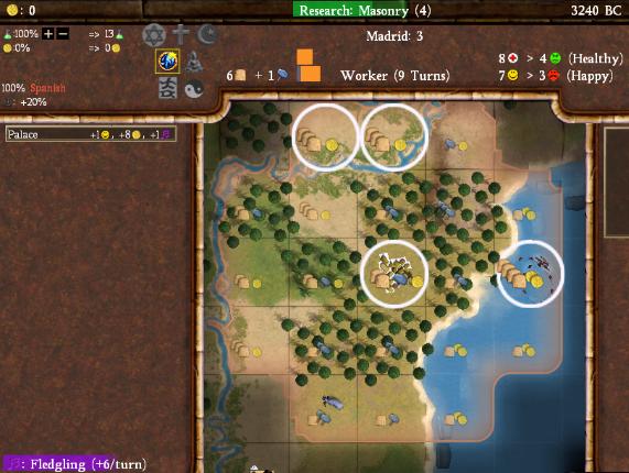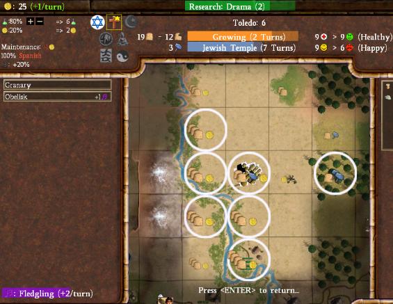 The city has no less than 7 floodplains in its territory. Seven! That's a lot! Once they are all irrigated, they alone will be producing 28 food/turn, enough to feed a city of size 14. This will allow Toledo to run a huge number of specialists down the road and become a Great Person factory. Once I reach Biology (which increases the food output of tiles with farms), it will only become that much more ridiculous. By the end of the game, I should easily be able to run 10 specialists at a time here. Cities with lots and lots of floodplains can thus become extremely useful to your civilization by contributing lots of Great People. (This works particularly well combined with the Caste System civic.) This city doesn't appear to have great land, but it will be far from useless for me down the road.