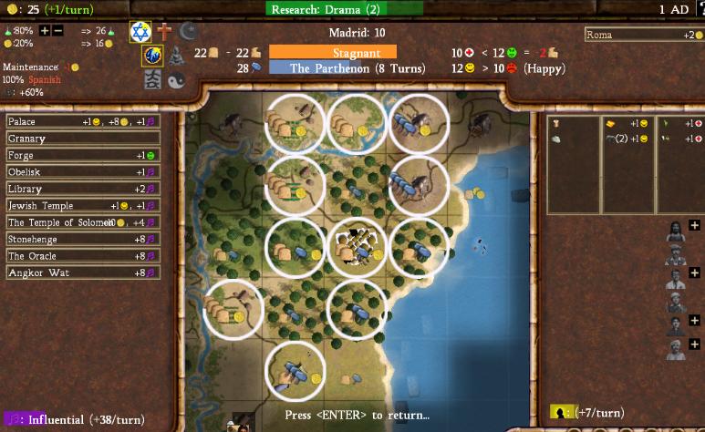 Each Great Person has a different function. Great Engineers can rush wonders or any city building, Great Merchants can conduct a trade mission to a foreign city for a huge amount of gold, Great Scientists can build a city improvement called an Academy that adds +50% science, Great Artists can add 1000 culture in any city with a Great Work, and Great Prophets can build religious shrines. They can also all be used to discover techs (or research towards a tech), and you can use them to trigger golden ages as well (2 Great Persons of different types needed for the first, 3 for the second, etc.) If you don't want to do any of those things, the Great People can also be "merged" into a city, where they provide other benefits like extra shields or commerce each turn. I used my first Great Prophet for the Jewish Shrine; you can see it here as The Temple of Soloman (they all have different names). That gets me 10 commerce/turn every single turn, and that will go up as I continue to spread the religion. That's a nice deal! All these wonders are also getting Madrid a pretty crazy amount of culture per turn, especially for this early in the game.