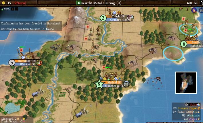 Judaism spread on its own to Barcelona (yes, that can happen) in 2080BC, prompting a slight change in my strategy. Since both my cities were Jewish, I converted my state religion from Hinduism to Judaism, and would be spreading Judaism as my state religion for the rest of the game. You have to be flexible and adapt as the game goes along. After researching Pottery, I next went after Mining (to, umm, build mines) and then Bronze Working (reveals copper and allows forest chops).