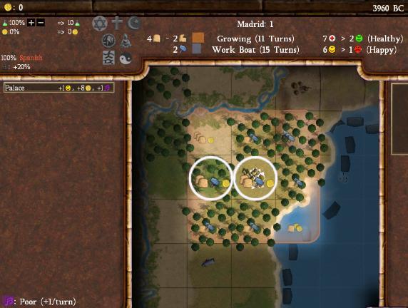 I have an interesting choice over what tile to work in Madrid. I can go with a high-shield tile, but then the city would barely be growing at all. I could also work the floodplains tile for high food, but then would only be getting 1 shield per turn. Usually, I would go with the floodplains tile to get as much food as possible, but in this case I've chosen to go with the silk resource, which is 2 food/1 shield/1 commerce. That's because my first build is a Work Boat; when it completes, it can build a fishing net on the clams and make that tile 4 food/2 commerce. Unlike building workers (which cause your cities NOT to grow while they are being constructed), cities can still grow while building Work Boats. By building a Work Boat, I was thus able to both grow Madrid and make progress towards hooking up one of my resources; it is usually impossible to do both at once. This is also why I am going with the silk tile over the floodplains; I will actually grow FASTER by completing the Work Boat sooner than by working the floodplains tile and producing the Work Boat later. Got that?