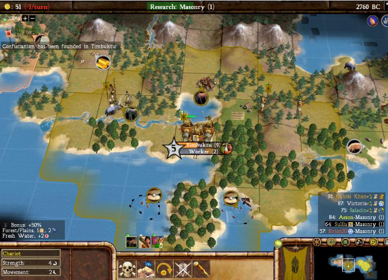 Aeson helped us out early on by building Stonehenge with forest chops that gave free border expansions for Sirian's and my cities (being Creative, Aeson didn't need it as much). The early wonder also generated a Great Prophet eventually that we used for the Confucian shrine (which pulled in some pretty hefty income; by the end of the game, it was close to 20/turn). By luck, I happened to have a very strong capital city for shield production, and along with a very early swap to Hereditary Rule, this allowed me to build some wonders in Timbuktu. Great Lighthouse (2220BC) and Colossus (1920BC) turned our fishing cities into powerhouses; since Mansa Musa is Financial, my water tiles were getting 2 food/4 commerce. That's crazy, especially for a Quick game!