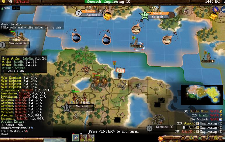 Aeson suggested early on that we try to take it to the Emperor AIs, so he guided us down a tech route that matched that. Aeson and I both had ivory, and he pointed out that cats + elephants would cut through archers like a knife through butter. We beelined for Construction therefore (we got it before Alphabet and Polytheism!) and otherwise rode the bottom of the tree. When preparing for war, I focused on building elephants while Sirian constructed a mixed array of units to meet any other situation (swords, axes, longbows, and most importantly a stack of 5 catapults). Aeson had to hold our eastern flank against Victoria while Sirian and I were going after Saladin (who was just across the bay to the south). Invading with galleys is a pain, but we dropped off a sizable stack after declaring war in 1440BC:
