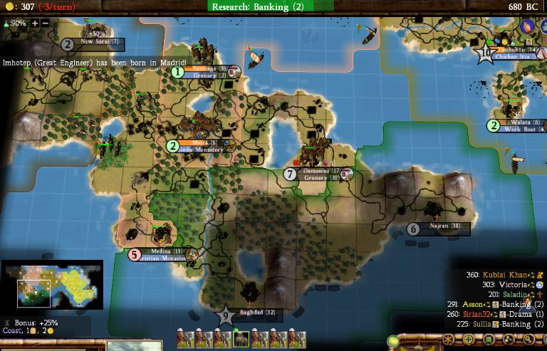 Sirian found a couple of bugs that he'll probably post here later, but I'll leave that to him. I'll end with a map I took of Arabia after most of it was conquered.