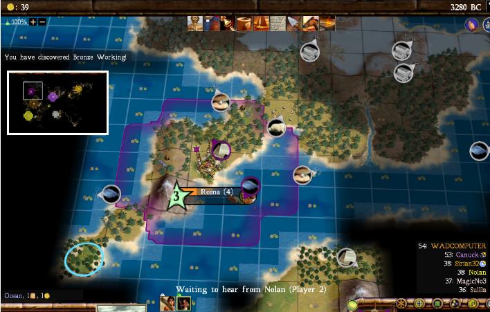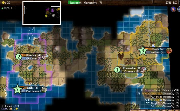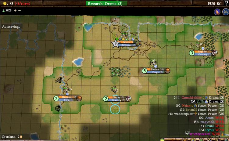 The biggest story of the night was probably the crashes. Aside from problems getting the game started, we had crashes in 3280BC (Nolan, Magic, and Canuck), a big one in 3040BC where everyone except Magic was taken out, another in 2360BC (Sirian), 2160BC (Sirian), and a final large crash in 1680BC that took out half the team again. It appears to have been the same unhandled exception each time causing the problems; I wasn't too sure what was happening, so I'll leave it to one of the other team members from last night to send in the bug report. Sirian has probably done so already, since it took him out multiple times last night.