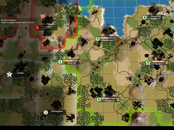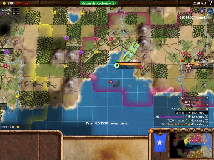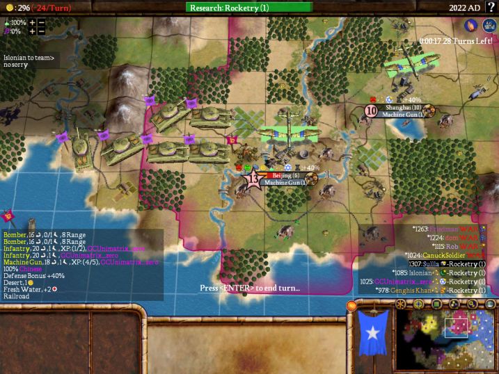 Two turns later, things look really bad, as Rob is about to roll into Beijing and end this game (it's Double-City Elim, remember!) However, between some extra defenders in Beijing and a flood of reinforcements from my cities and even a couple from Islonian (who was pretty far away!) our team managed to hold onto Beijing. Of course, our team was hopelessly far behind in points by this point in time, but we did manage to prevent Unimatrix from being eliminated. The fact that CanuckSolider dropped at some point in time around here and was replaced by danthrax no doubt helped our team out too.