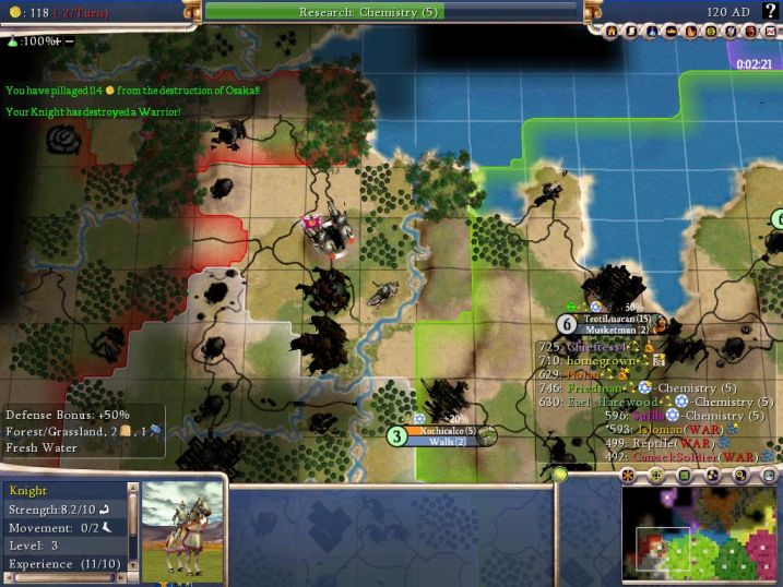 Anyway, at this time my team was building up for an attack on Canuck's city of Osaka. You can see above the knights that I was holding in reserve back where the other team couldn't spot them. Earl had built 7 Camel Archers, and I had 5 knights; just when we were getting prepared to attack, several people dropped and the game basically came to an end. Gah, just needed like 3 more turns! Well, even though Canuck had left the game (and it wasn't fair to beat up an AI), we went ahead and razed his city anyway.