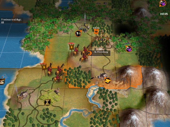 The result was preditable; St. Petersburg was taken with the loss of a keshik or two, then the rest of my army wheeled to the northwest and headed to Moscow. The keshiks were able to get there in 2 turns, and the 2 archers and a warrior in the city were easily overcome. Just like that, Fried was gone. He very kindly complimented me on the attack and retired from the game.