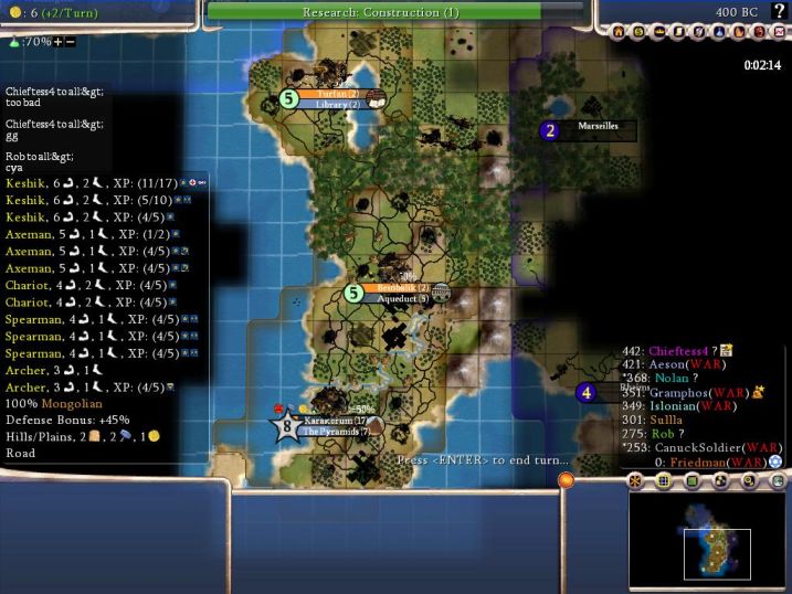 Seeing that Fried was isolated, Canuck and Reptile had declared war early on and there was a great deal of fighting in our west. Fried was basically totally on his own for most of the game (we couldn't send anything west for quite some time) and held the line magnificently. Fried guided our research path and early on had us grab Bronze Working, then Iron Working (for his Jags, as Azteca), and then Metal Casting. Meanwhile, I built Stonehenge, then the Oracle (in TWO turns! gotta love Quick + Industrious) and used it to grab Machinery as the free tech. We thus had a LOT of the military techs at the bottom of the tree pretty early on. homegrown, if you had chosen to attack me at this point, you would have gotten a face full of Chu-Ko-Nus.