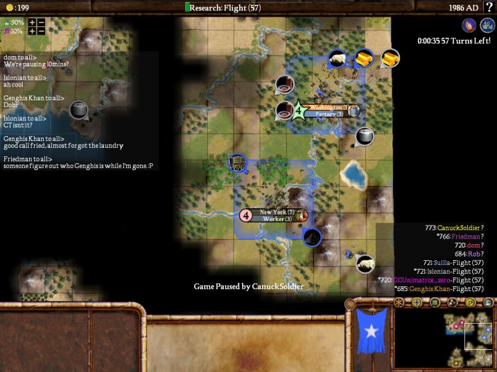 ) and proceeded to grab not one, but TWO Great Engineers by 2001AD. That's within the first 11 turns of the game, heh. Now Fried and I were arguing a bit about this; Fried maintains that you could do this with any Philosophical civ (by running 3 or 4 Engineer specialists ASAP), I believe that the Roman Industrious/Philosophical combo played a big part as well. So by way of making my argument here, I will tip my hat to Fried on some very nice play, but I maintain that no civ aside from Rome could not have gotten those wonders at the same SPEED he did. A civ that was not Industrious would not be able to build the factories at half cost, so would take longer to be able to run more than 2 Engineers (Mercantilism + Forge), so would take longer to generate the Great Engineer. Of course you probably COULD rush the factory with Universal Suffrage - or would you have enough money for that? I don't know. It's kind of a moot point now because we killed off the Industrious/Philosophical combo AND Industrious doesn't give half-cost factories anymore either (that will improve balance for late-era starts, because at the moment Industrious is far and away the best trait for the late starts).