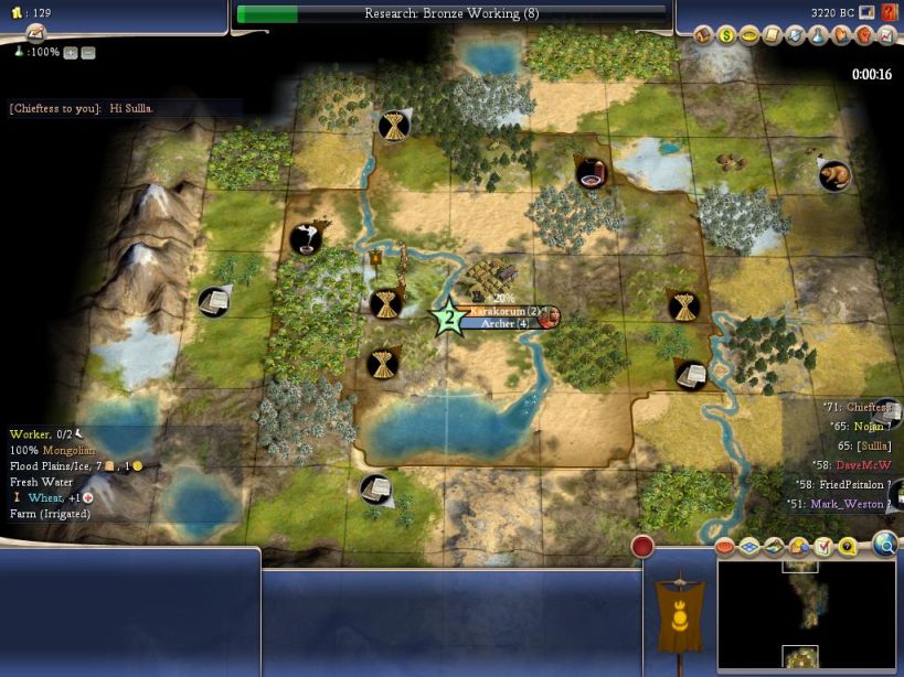 Here's the start I drew. It was definitely a good one, with a nice mixture of hills for production and floodplains for commerce. You can already tell from this picture that wheat was one of the resources picked to "go crazy" for the map, and I had three just in range of my capital. The ice/floodplains/wheat tile was absolutely insane on the food production, giving me SEVEN food once I irrigated it! The return of the uber tile!