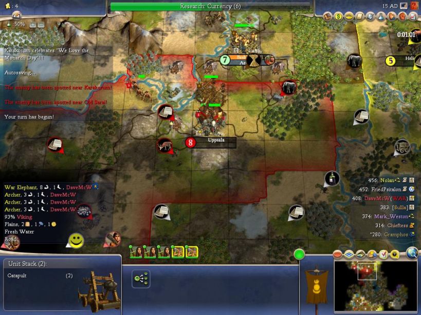 ) Now since I could see into Dave's city that was fighting mine in culture, I knew he only had two archers for defense. It was... surprising to see such light guard on a city that we were contesting over, even though the border had remained peaceful so far. I wondered if Dave was just trying to bait me into an attack, but no, F9's power graph revealed that he was lowest in soldiers. Since Dave was also spiraling upwards in GNP, and sure to start teching away with the game, the time to attack was now. I would have done it sooner if I could have gotten a danged resource earlier!