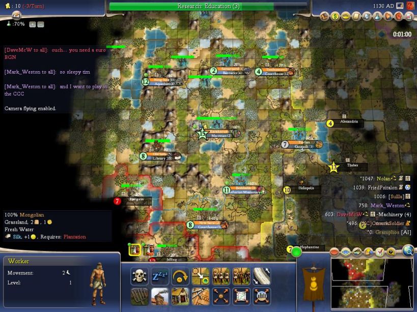 Now that Dave couldn't declare war on me in the south (can you confirm this Dave? I think that's how it works) and Nolan wasn't going to declare war on me in the east, I felt pretty secure and went into building mode. I straightened out my GNP and built a lot of cottages, and it took off pretty nicely. I founded about 3-4 more cities once my finances were repaired and was in pretty good shape. I put an Academy in my capital, and that along with Bureaucracy and a lot of cottages had me humming along nicely. Fried, Nolan, and I were tops in most categories as the game wound down. Mark, however, had a huge army of something according to the power graph - I was just glad he was on the other side of the world from me! Gramphos got eliminated by Mark, not sure what was going on over there - maybe one of them can fill us in. Chieftess/Canuck seemed to struggle a bit, it sounds like they had poorer land (?)
