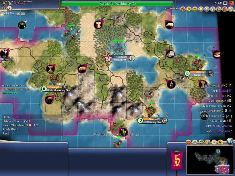I didn't play nearly as many Multiplayer games for Warlords testing as I had done before Civ4's release. There was an attempt to start up some of the same weekly games as before, and I did take part in a few Big Game Nights organized by Friedrich, but it was never quite the same as it had been earlier. The Warlords testing group was larger and had a bunch of new faces which disrupted the small community feeling that we'd had earlier; I don't begrudge bringing in additional people for more feedback but things did feel more like standard Multiplayer games and less like our old crew getting back together again. This page covers the one Warlords Multiplayer game where I have a report saved, along with a few other screenshots from games that lacked a writeup.