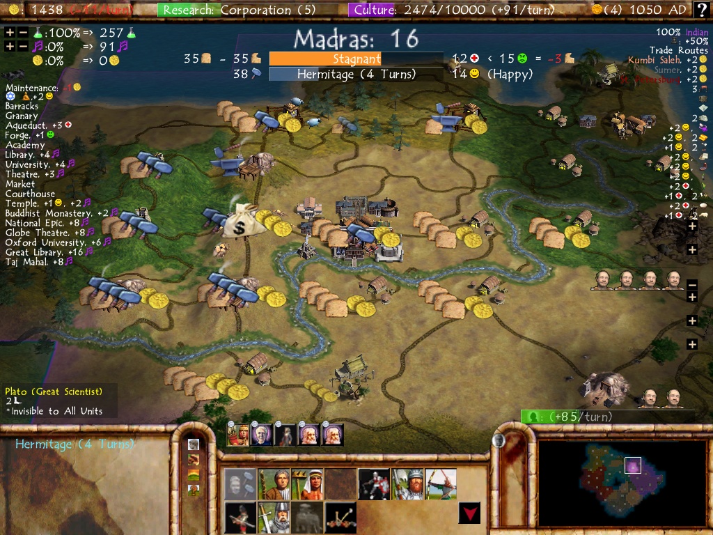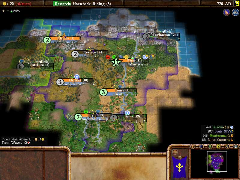 This screenshot from SPGT9 was interesting for having Augustus Caesar and Gilgamesh present, both of them leaders which would be cut from the release version of Civ4 and not appear again until the arrival of the expansions. I'll also point out the symbol being used for Hinduism in these earlier builds, which was based on some famous sculptures of the god Shiva but wasn't tied directly to the religion itself. This was caught by the testing group, one of whom suggested using a more accurate symbol for the religion and the replacement was made before the game released. Note as well that the units had colored flags attached to them by this point but everyone was using the same generic eagle symbol, which worked OK for some background colors and didn't fit at all for the bright pink of Napoleon's France.