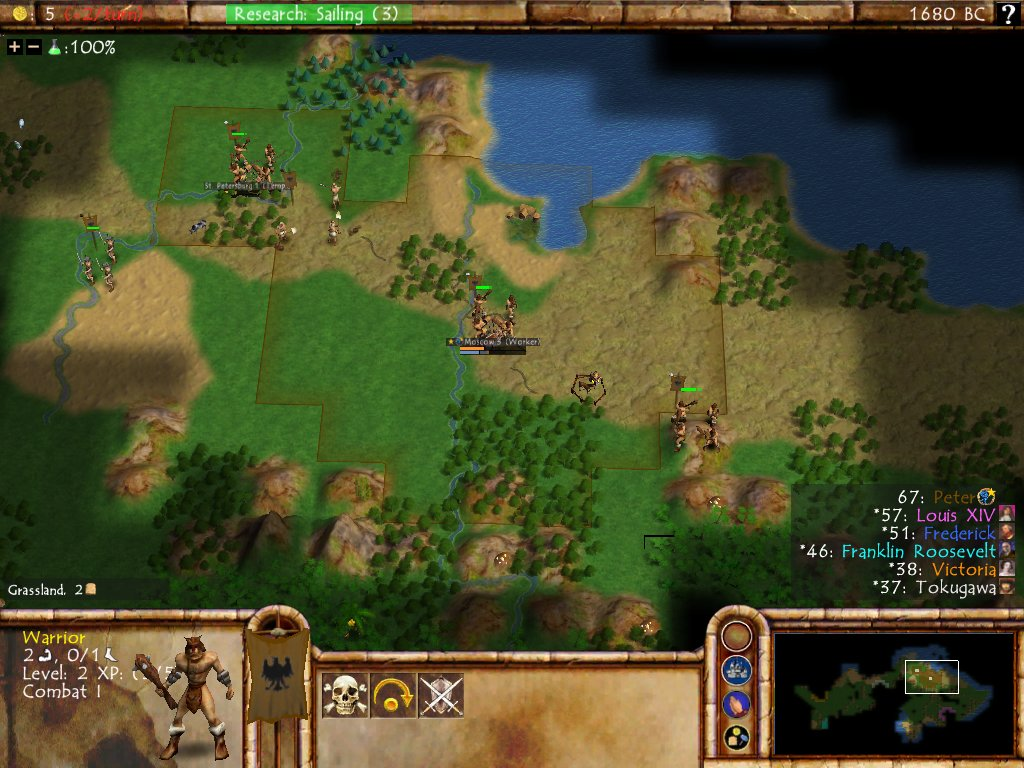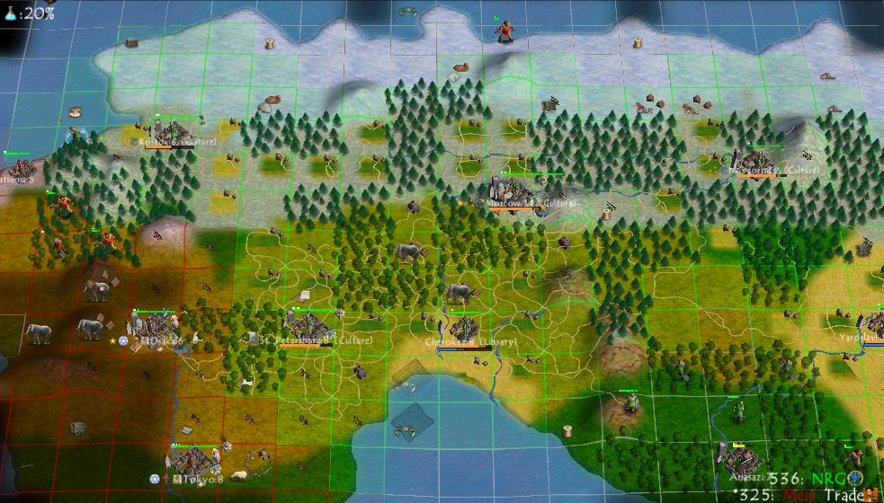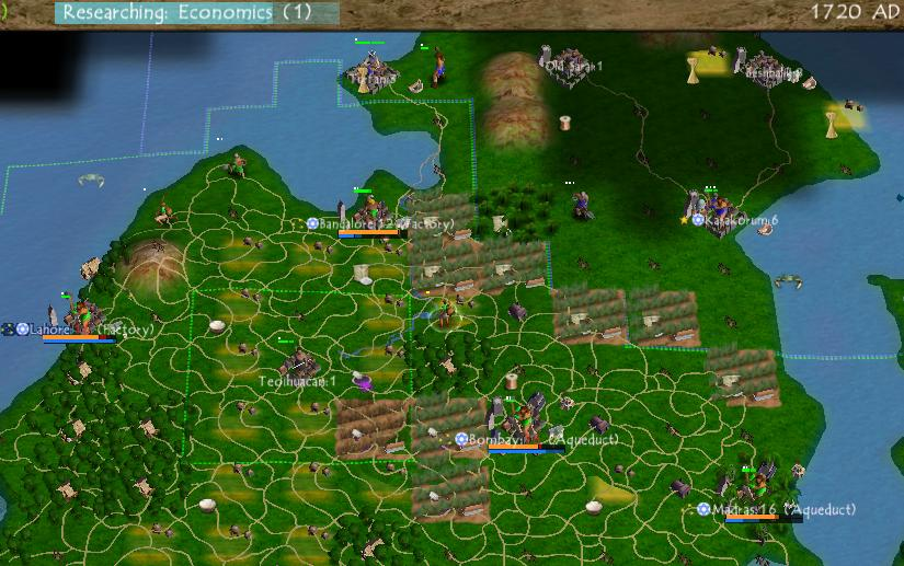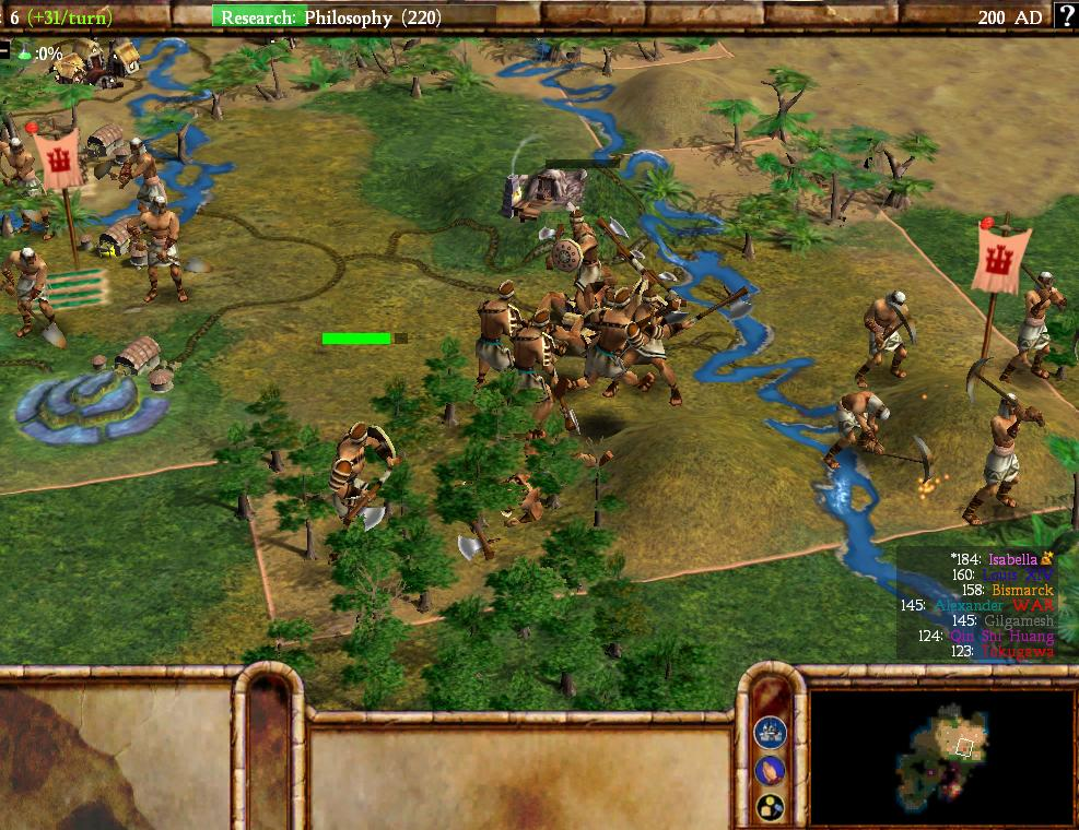 Here's a more zoomed out view from the same game. The early builds from this period have always given me the vibe of Warcraft 3, with the buildings and the terrain evoking a similar feel. This is probably due to the two games being developed at a similar time (Warcraft 3 came out in 2002 while these Civ4 builds date from 2004) and having a similar aesthetic. Civ4 would shift in a more serious direction during the final year of development in 2005 and the resemblence faded away by the time of release.