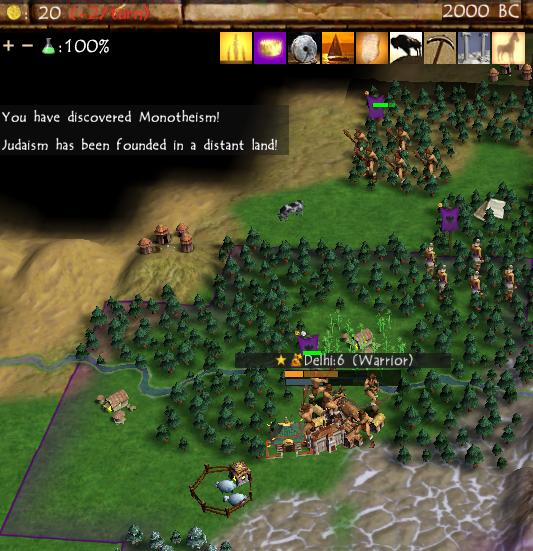 This image was taken from the very next group testing game, SPGT7. I saved this picture because it captured the tech icons that Civ4 was using at the time, many of which were placeholders pulled directly over from Civ3. If you're at all familiar with the Ancient era tech tree in Civ3, you'll be able to spot the icons for Polytheism, Monarchy, Horseback Riding, etc. The Civ4 techs that didn't exist in the previous game, like Hunting and Mining, are the ones with the roughest clip art since the developers knew that they were going to be replaced. I think that Sirian took this screenshot because he was highlighting that he discovered Monotheism only to have Judaism be founded in a distant land. This was quickly fixed: ever since, the player has always won any same-turn ties in Civ4 (by virtue of the face that the player is always in "Slot 1" and ties are resolved in slot order.)