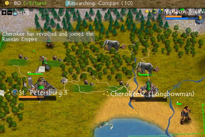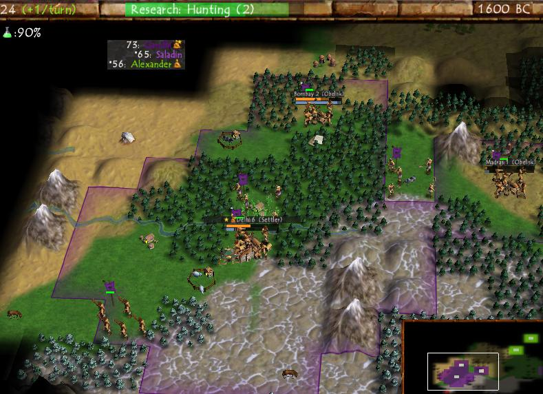 Here's a zoomed in picture from the same point in development. It's easier to see here that the warriors and longbows are using the Civ3 graphics due to lack of finished art assets for Civ4. The units also have their respective national colors (green on most of them and black for the warrior in the southeast) although they lack the unit flags which would later become one of the trademarks of Civ4.