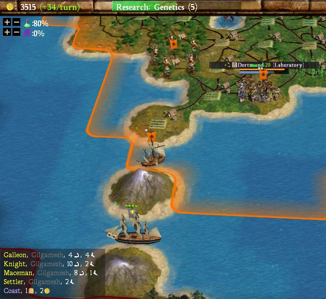 I saved this picture from that same SPGT15 game because it captured one of Gilgamesh's galleons at sea. This was just before Gilgamesh was cut from the release version of Civ4 (he was already gone when I gained access to the testing group) and I always thought of this as his farewell voyage, sailing off into the west in Lord of the Rings fashion and all that. The poor guy was a very late cut and almost made it into the release version before having to wait for the Beyond the Sword expansion. Note that Sumeria essentially kept the same national flag symbol all through that long delay, with a bull's head staring straight ahead just barely visible on that little ship.