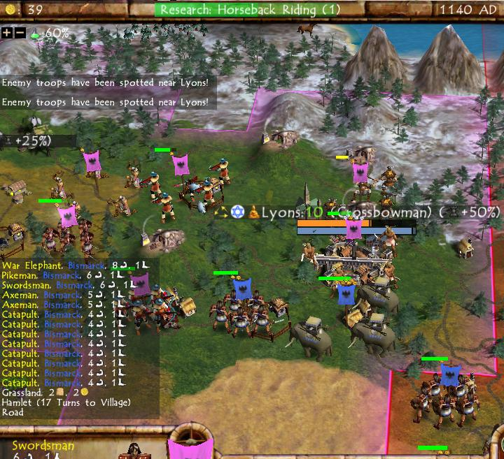 This image from the same game depicted a military clash between Napoleon and Bismarck. The biggest detail for me is the number of figures in each military unit: most of them had 5 individuals present instead of the 3 figures used by the release game. Similarly, there were 4 people in each worker unit and 3 elephants in the war elephant unit, instead of the 2 of each employed by the finished game. I wasn't part of the discussions that led to this change, however I believe that the rationale for decreasing the number of figures in each unit was that they looked too cluttered and the animations took too long to play out. Those extra individuals being there look weird after being used to the 3 people in the finished game for such a long time. Note also that catapults only had 4 strength in this build which likely made them too weak given when they appear on the tech tree.