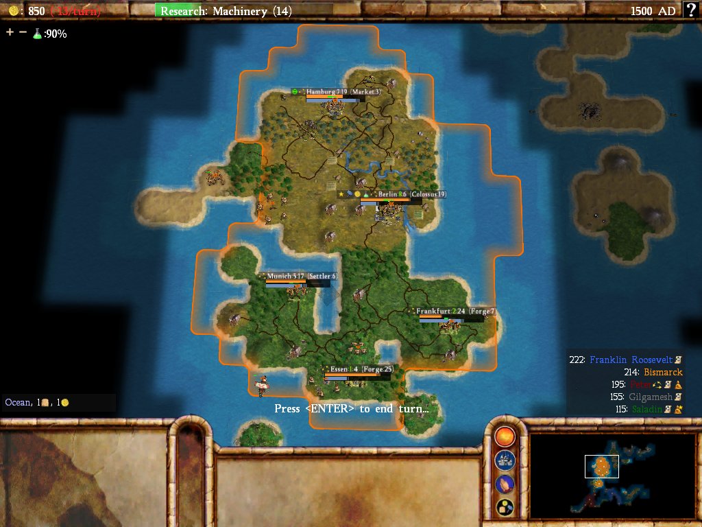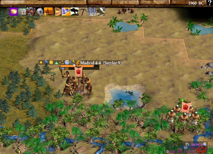 This next image comes from about a month later during the SPGT15 game which would have been played around March 2005. This was taken from an archipelago map and indicates that the water tiles were essentially done at this point though the various land terrain tiles would receive some more visual updates before release. Interestingly, the American leader was still being listed as "Franklin Roosevelt" at this point before being shortened to "Roosevelt", and Gilgamesh was still kicking around too. On that note: