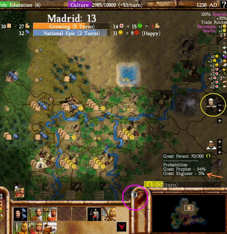 Enough of the overview map, how about a look inside one of the cities from this point in development? The city screen had the same basic format even at this early date, with the screen zooming into the 21 tile radius in the center along with completed buildings on the left, resources and specialists on the right, and then the build queue options at the bottom-center. One bizarre aspect of this city screen is that the city's culture bar appeared at the top of the interface next to the research bar, an unintuitive spot which would later move to the bottom-left corner. More amusingly, the early city screen was using the Civ3 advisors for the specialist graphics, with Sid Meier's Science Advisor face popping up here as the Scientist specialist. The bottom-center of the screen has the placeholder graphics for some of the Great People along with unfinished unit art for everything other than the worker, pikeman, and knight. I remember the testing builds that I played having a lot of brown squares for various units there, especially the unique units which were some of the final ones to get their art assets.