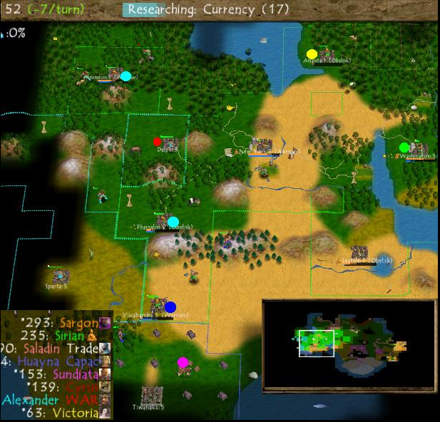 This screenshot is from a related build though I think it's slightly further along in development time. This was one of Sirian's screenshots and it contains one of his infamous dot maps, complete with a pink dot down in the south for reasons that have been lost to history. The main thing that I wanted to point out in this screenshot is the list of leaders that Sirian pasted onto the left side. There are several leaders here who never made the cut for inclusion into Civ4: Sargon (Sumeria) and Sundiata (Mali). The original design concept for Civ4 was going to have 20 civs with two leaders apiece for 40 total leaders before a bunch of them had to be cut for asset reasons; I have another page that will cover this topic in more detail. Also note that the colors for each civ are completely crazy in comparison to the finished game, a rainbow of bright shades that bears no relation to where they eventually ended up. Orange Saladin, blue Huayna Capac, and red Cyrus all look bizarre to those who have been playing Civ4 for the last two decades.
