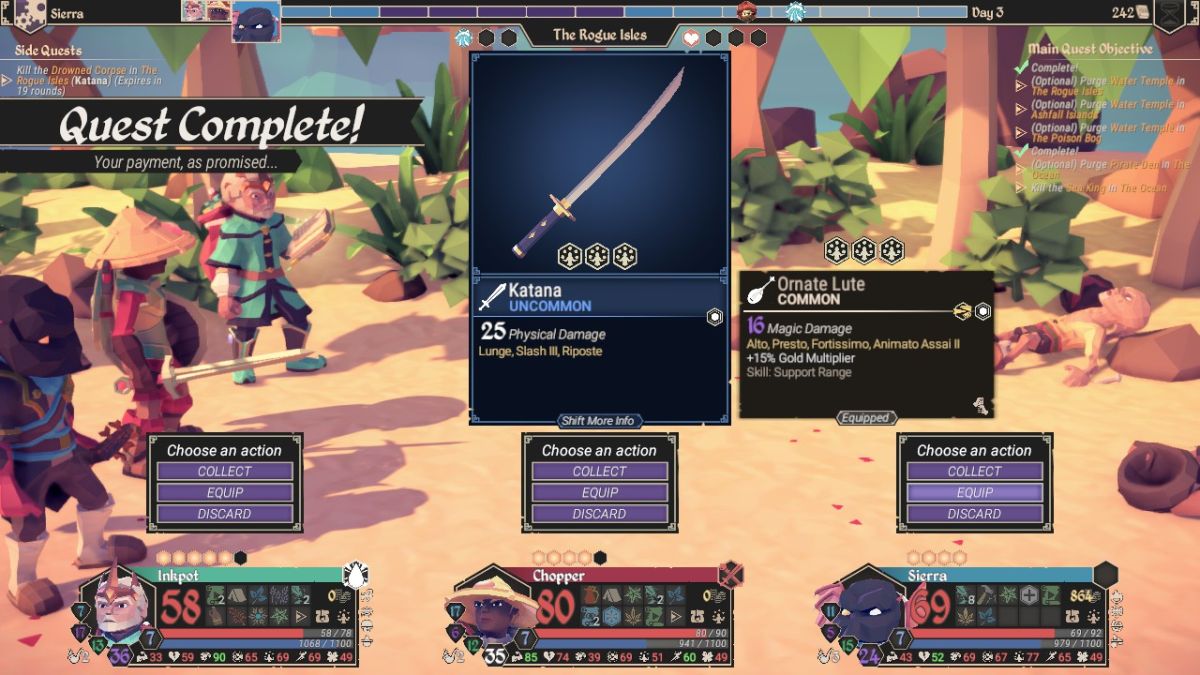 Taken in full, Into The Deep mode is a lot of fun to play. It's definitely easier than the classic For The King and Dungeon Crawl modes, between the longer time granted between new ticks on the Flood Meter and easier dungeons to clear out. Moving on the ship is also easier than moving on land, as your characters stay grouped together as a party and it's much easier to avoid unwanted battles due to the wide open spaces on the ocean. The hardest part of For The King comes from the need to balance exploring the map against keeping your characters concentrated as a party, and Into The Deep mode largely allows the player to avoid those dilemmas. With that said, the default For The King mode is extremely difficult and beyond the abilities of most players, so I'm glad that the other game modes that the designers have been adding have erred on the side of being more forgiving. Into The Deep is a more structured setup like the For The King mode, and therefore likely won't provide the same amount of replayability as Dungeon Crawl mode. I still think that Dungeon Crawl is the most interesting setup for variants or other experimental playthroughs due to the way that it keeps changing from game to game.