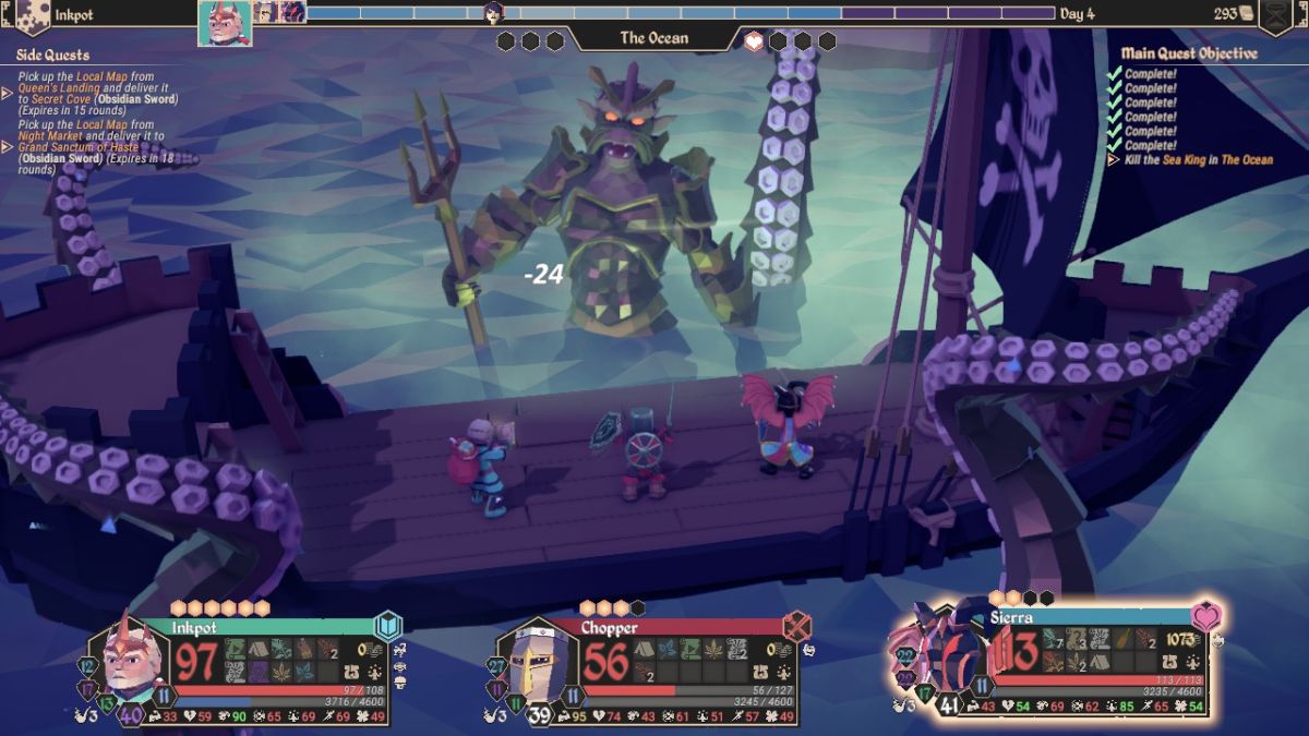 This fight takes place not inside a tower or atop a mountain peak, but from the deck of a heaving ship. Just as the Kraken can choose to go after your ship in that encounter, the Sea King and its Tentacles can do the same thing. I soon discovered that the Tentacles have an attack that deals 2 damage to the ship (reduced to 1 damage by the Pirate Boat's one point of Armor) while the Sea King has an attack that deals 3 damage to the ship (reduced to 2 damage by the Pirate Boat's armor). It didn't take a genius to realize that this was a dire threat indeed, with the 14 HP on the Pirate Boat suddenly not looking as sturdy as it had a bit earlier. I concentrated on downing first the right Tentacle, then the left one to remove their chance to smash apart the Pirate Ship. Good news: I found a Ship Repair Kit in Sierra's inventory that added +2 HP back to the ship. Bad news: I only had one of them and it was gone as soon as I used it. Note to self: make sure to purchase more Ship Repair Kits when playing this game mode in the future. Like, a lot more Ship Repair Kits.