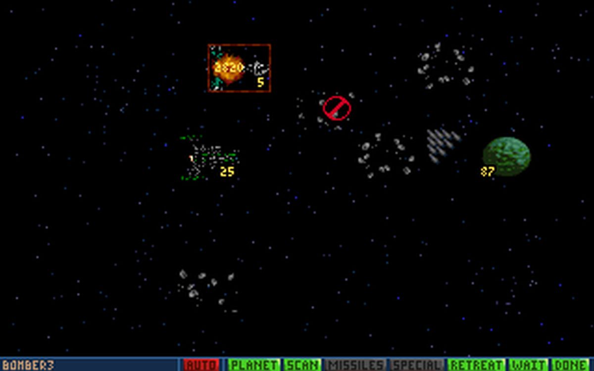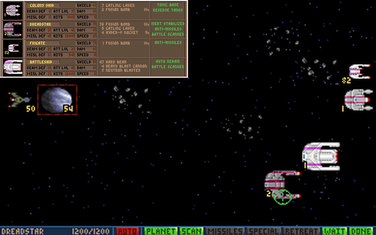 The one advantage of slow movement on the combat screen meant extra space to pack in more goodies on starship designs. I had earlier traded for the Autorepair special and therefore designed my fleet around big lumbering Huge designs; you really don't want to build pathetically slow Small ships as they'll take incredible casualties in any fight. I loaded up a Huge design with that Autorepair special and some Heavy Fusion Beams and Fusion Bombs, plus as much shielding and ECM tech as I could fit. I was planning my first attack for the Mrrshan planet of Gion, located to the southeast of Anthill in the center of the map. The cats only had 4 points of shielding and even though my Huge ships took a pounding, with 3 out of 4 dying to missile fire, the last one reached the planet's surface and obliterated its defenses. Unfortunately I hadn't been able to scout this planet in the early game and therefore couldn't send invasion transports until after gaining space superiority. And then those transports were forced to lumber towards Gion at warp 2 speed, losing even more speed when they passed through Antihill's nebula. This wouldn't have mattered except that my "allies" the Humans and Bulrathi sent their ships to the same target and...