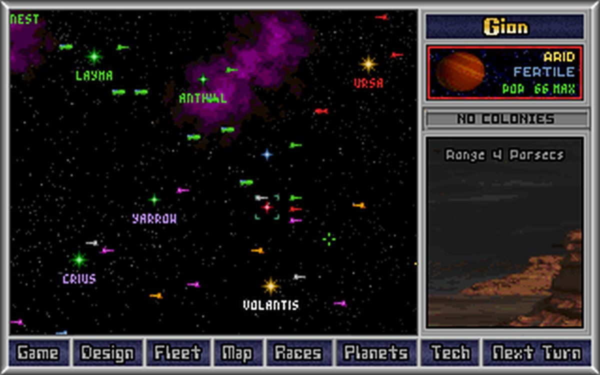 The Klackons build their initial factories very, very quickly on the homeworld, even when having to pay maintenance on the starting colony ship for half a dozen turns. I maxed out The Nest in barely 20 turns and then opened up the Propulsion and Planetology research fields. Range 4 tech was available and all that was needed to spread out, then I was delighted to find that Controlled Barren and Improved Eco Restoration were both options in Planetology. This was the incredibly rare game where Controlled Barren tech had a higher priority than Improved Eco Restoration but if ever there were a game where I needed to be able to colonize Barren worlds ASAP, this was surely it. The homeworld and that powerful second colony of Earf knocked out the Range 4 / Controlled Barren combo in short order, followed by The Nest building some 3 turn colony ships (go Klackons!) to claim the local neighborhood. I grabbed the Barren planet to the southeast, then planted my flag over the critical Minimal Rich world which we named Anthill.