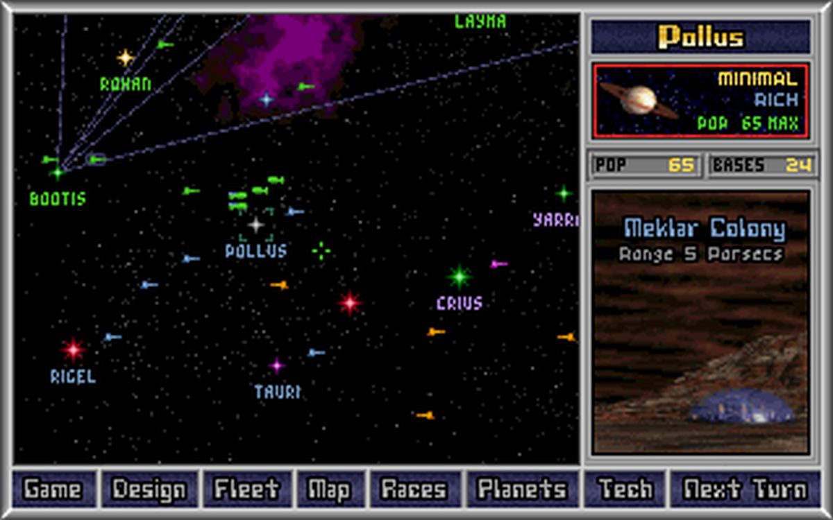 The next two dozen turns were clinical in nature as I ran over the remaining Meklar worlds. My slow engines meant that I took significant casualties on my bombers each step of the way, and yet the borgs couldn't stop me from taking whatever I pleased. I captured Rigel and Tauri, then raced forward to take the cyborg homeworld of Meklon before someone else could claim it. Meklon had 58 bases and took out nearly 20 of my Huge bombers (ouch!) but once again couldn't stop the stack from reaching the planet's surface and dropping ordinance all over it. There I looted the most critical tech of all: