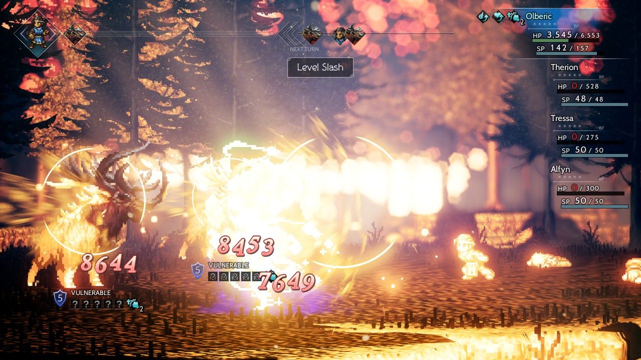 I could finish the remaining four bosses in any particular order and chose to complete Alfyn's quest next. The Forest of Rubeh dungeon was noteworthy for having a random encounter that didn't wilt immediately to the boosted power of Level Slash. The Devil Deer monsters (the ones that look like evil moose) were a legitimately dangerous opponent, buffing up their own physical attack and then hitting like a truck for well over 1000 damage. They also had 8800 HP and no weaknesses that Olberic was able to exploit, outside of burning through more soulstones which wasn't practical for a random encounter. In the picture above, they were able to tank a Level Slash that did more than 8000 damage and keep on trucking. This was exceedingly rare at this stage of the game and Olberic had to eat some Medium Healing Grapes in between fights to stay healthy.